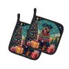 Pair of Pot Holders featuring breed specific Rottweiler artwork. Celebrate Christmas with this Christmas Pair of Pot Holders. A Pair of Pot Holders to match your kitchen decor. Made in the USA these are thick and functional. Full color artwork decorates the front polyester fabric of the hot pad and accented by a black trim. Use these at as a trivet for your Thanksgiving or Christmas tablescape. Filled with insulated fabric and quilted for durability. These colorful pot holders will make a great gift for your favorite home cook or executive chef. Each pot holder measures approximately 7 1/2 inches by 7 1/2 inches. A hanging tab is included.